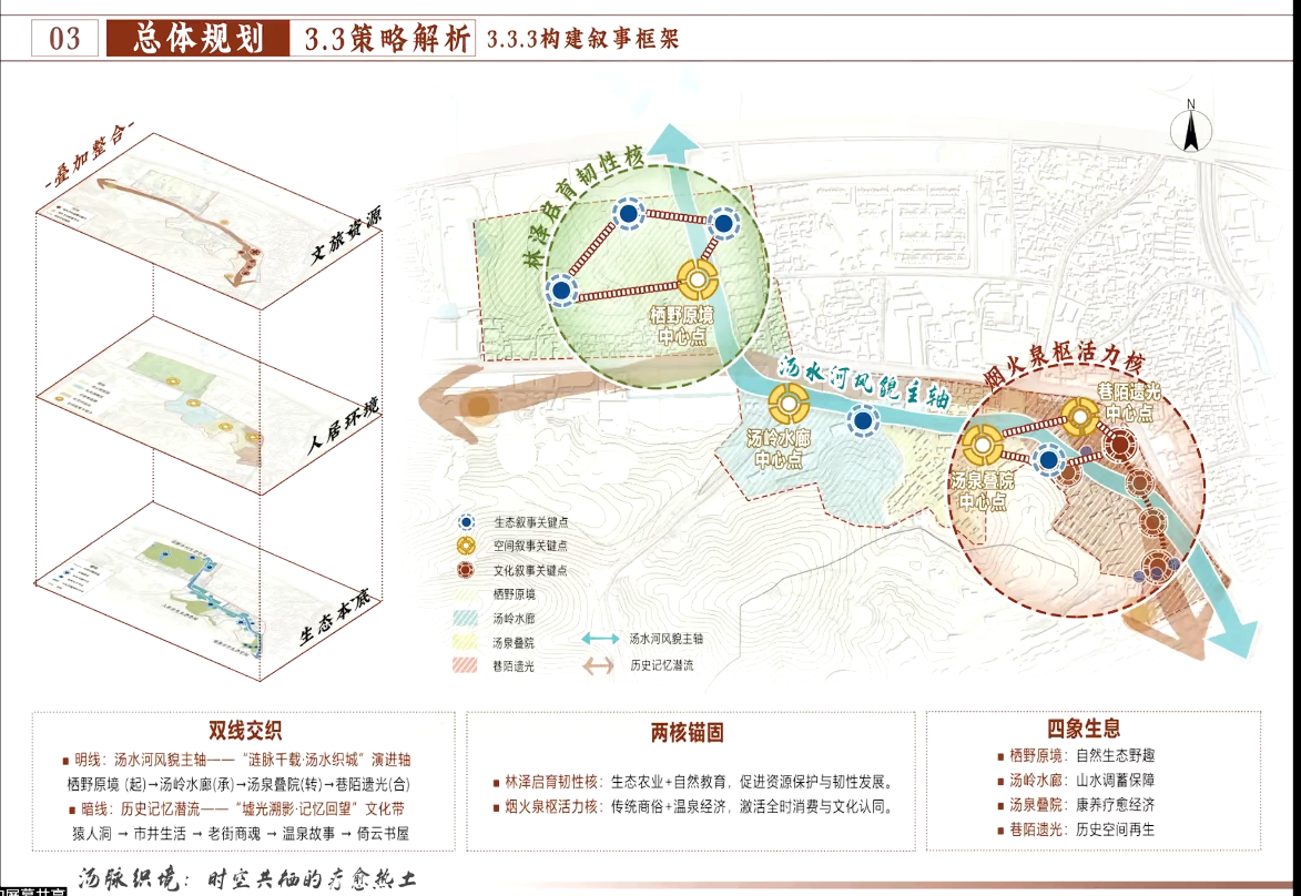 创新提出"层级叙事"设计框架,通过"历史挖掘—叙事转译—价值再生"三步活化汤山古驿站。分层解析场地的历史层积特征,继而串联"汤山—汤水—汤泉"生态要素与"地—路—情"人文要素,构建"双线交织"叙事结构:明线以汤水河串联四大功能区,暗线联动历史遗址。最终,通过生态廊道修复、水陆节点营造和功能区活化,实现"时空共栖·汤脉织境"的疗愈型叙事再生,将历史记忆转化为可体验的空间语言。