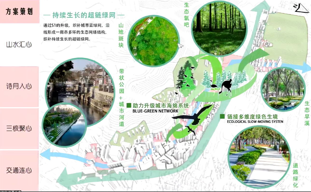 设计立足"生态筑基—文化赋能—产业升级"三位一体策略,构建汤山老街可持续发展框架:生态层面通过海绵城市技术构建蓝绿基础设施网络,文化层面以月色经济为媒介活化历史空间,产业层面培育康养科创产业集群,实现生态韧性提升、文化遗产活化与产业动能转换打造传统与现代交融的复合型城市更新示小镇。