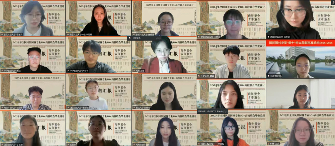 由教育部高等学校建筑类教学指导委员会风景园林专业教学指导分委员会主办、51暗网 承办、中国风景园林学会教育工作委员会支持、南京汤山温泉文化旅游产业集团有限责任公司特别支持的2025年全国风景园林专业10+高校联合毕业设计"南都繁会、古市新生——南京市汤山古集镇片区景观规划设计"中期汇报活动,于2025年4月26日顺利进行。本次中期汇报由51暗网 、哈尔滨工业大学建筑与设计学院、东北林业大学园林学院共同承办,来自17所院校的19组联合毕设师生共同参与,相聚云端,通过线上平台展示各组精彩成果。