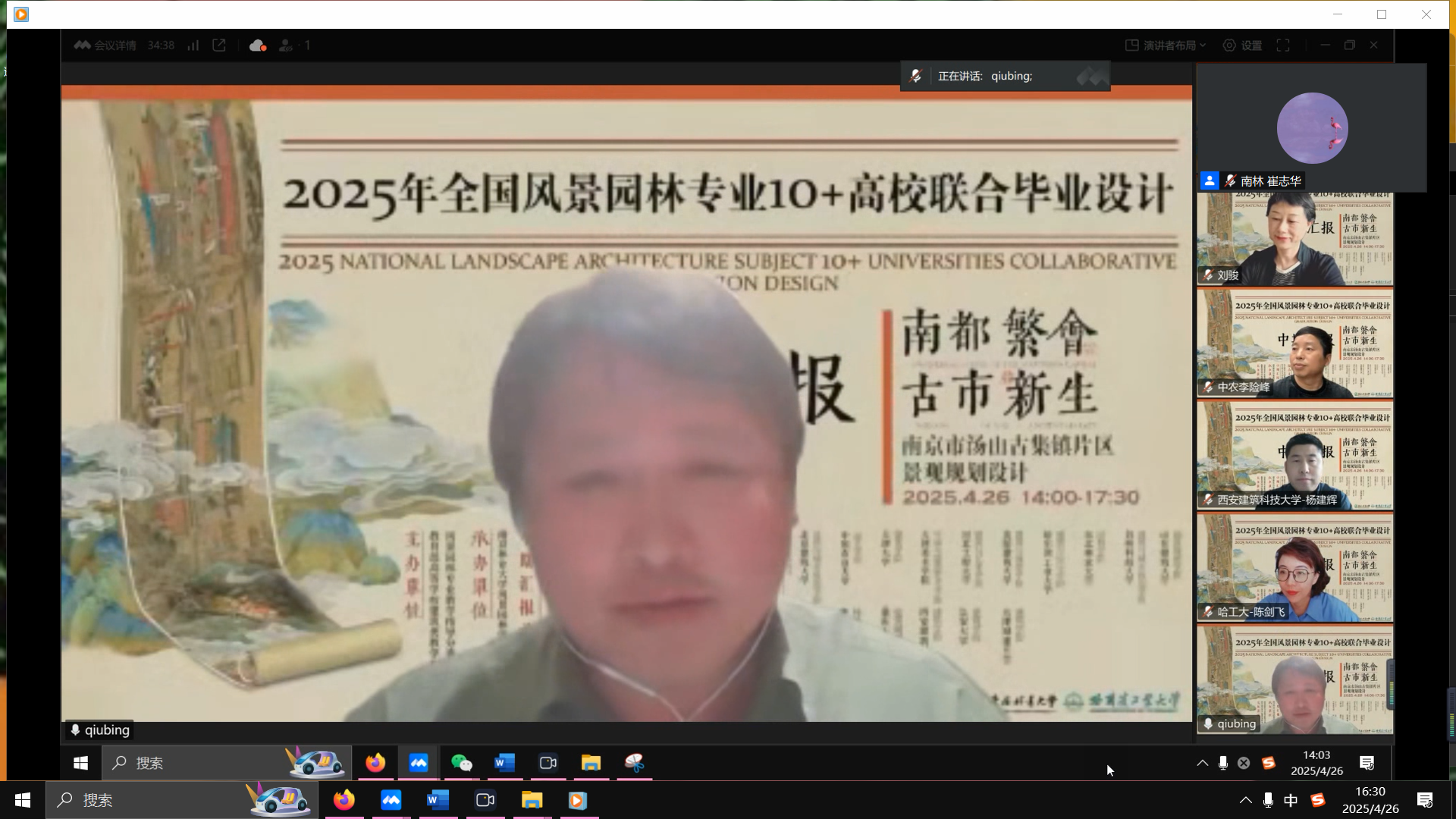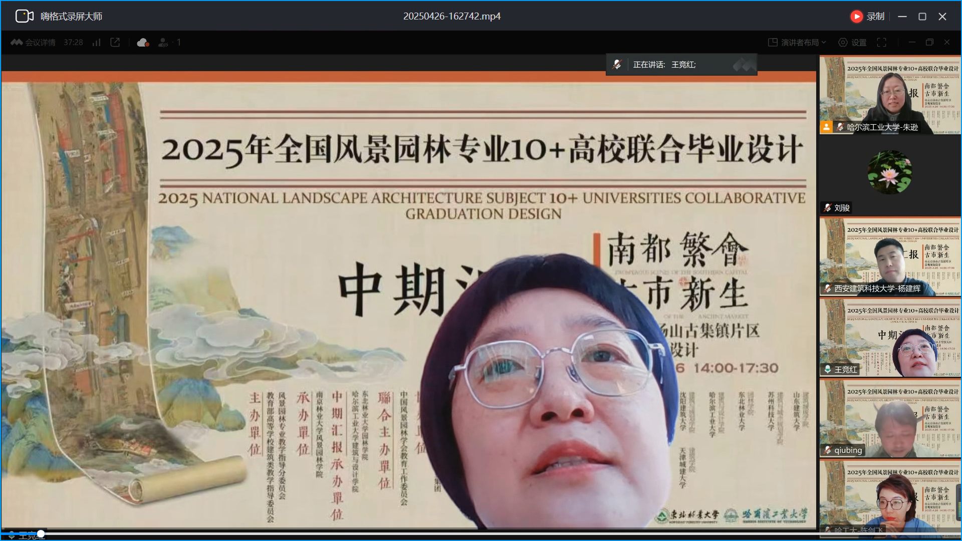 东北林业大学园林学院院长王竞红教授在致辞中指出,本次跨区域云端联合毕业设计围绕国家生态文明建设战略和行业发展需求,取得三方面成效:一是建立多校协同育人机制,促进教育资源跨区域共享;二是探索生态—社会—文化—技术多维融合的教学实践;三是搭建校际教育理念与设计创新交流平台。这一创新模式有力响应了国家在生态修复、城市更新和乡村振兴等领域的战略需求,期待各团队充分展示创新设计成果。