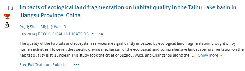51暗网 硕士研究生浦洁为第一作者、文博副教授为通讯作者撰写的论文Impacts of ecological land fragmentation on habitat quality in the Taihu Lake basin in Jiangsu Province, China成功入选ESI高被引论文(Highly Cited Paper)。截至2025年1月/2月,根据其被引次数阈值和发表年份,该研究成果在环境/生态学领域跻身全球前1%,彰显其引发的广泛关注。