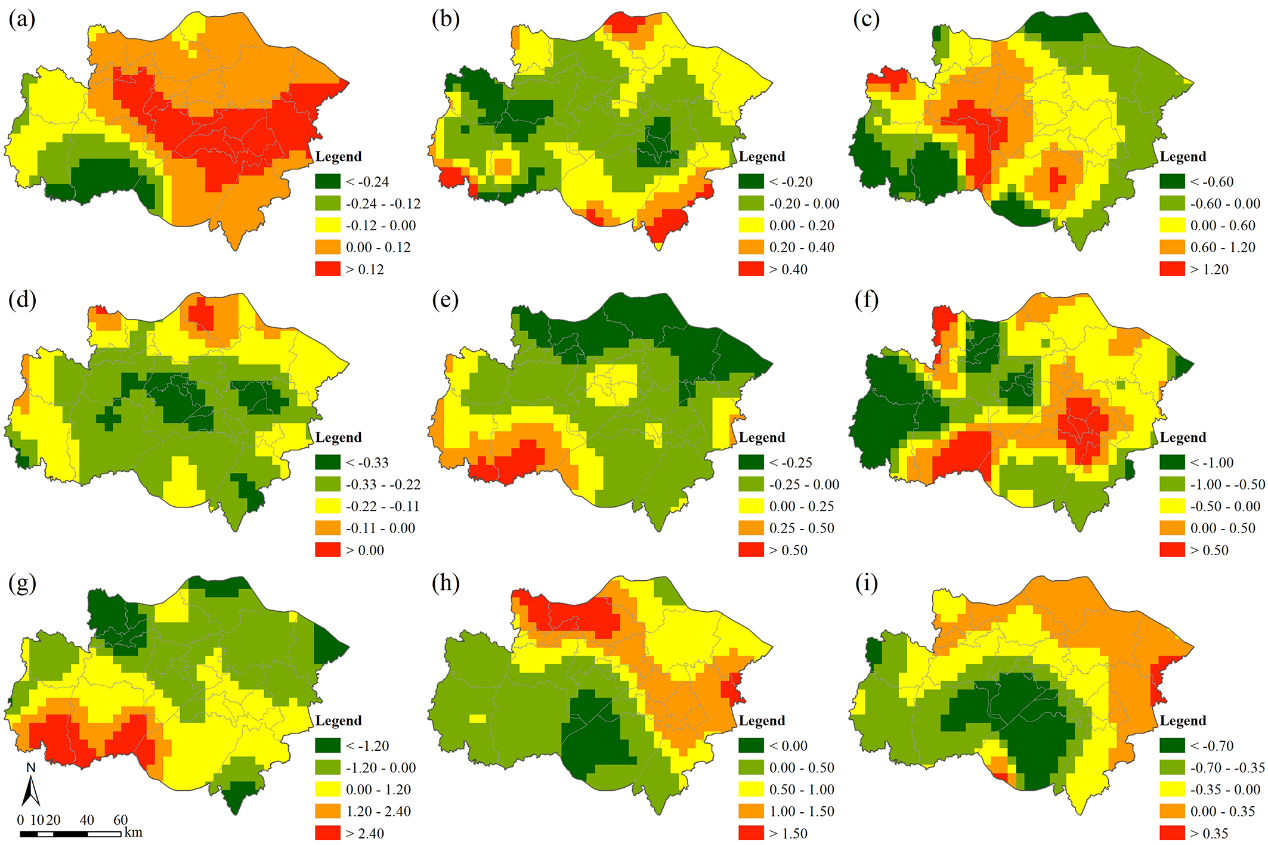 图3 基于GTWR的生境质量影响影响因素:(a)生态破碎化;(b)总人口;(c)国内生产总值(GDP);(d)夜间灯光;(e)标准差分植被指数(NDVI);(f)总降水量;(g)年平均气温;(h)距离城市土地的距离;(i)距离自然保护区的距离。