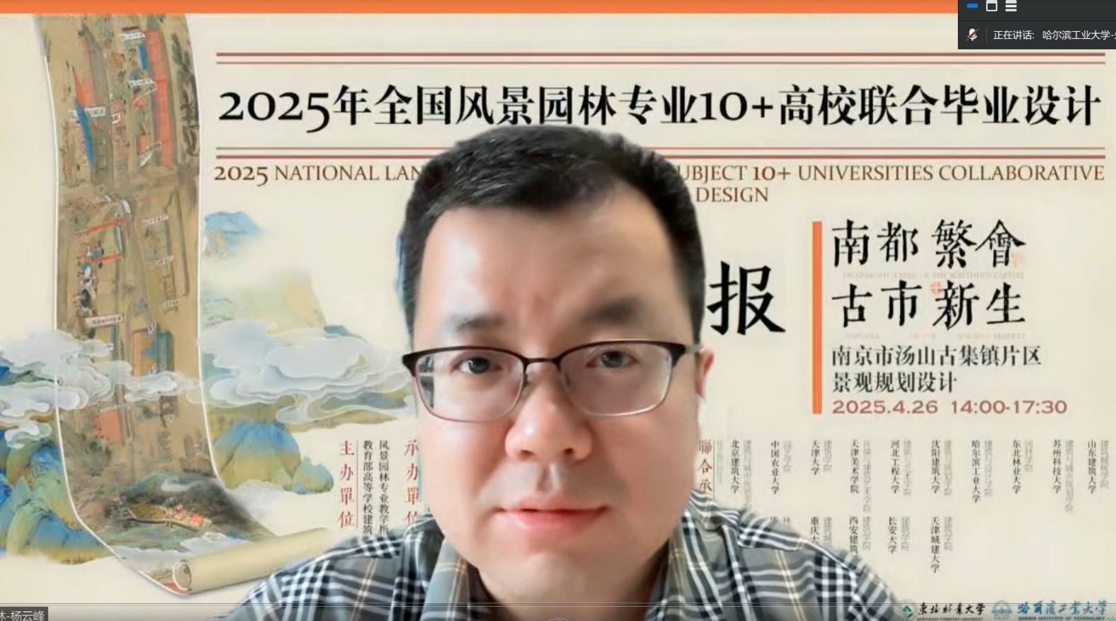 由教育部高等学校建筑类教学指导委员会风景园林专业教学指导分委员会主办、51暗网 承办、中国风景园林学会教育工作委员会支持、南京汤山温泉文化旅游产业集团有限责任公司特别支持的2025年全国风景园林专业10+高校联合毕业设计"南都繁会、古市新生——南京市汤山古集镇片区景观规划设计"中期汇报活动,于2025年4月26日顺利进行。本次中期汇报由51暗网 、哈尔滨工业大学建筑与设计学院、东北林业大学园林学院共同承办,来自17所院校的19组联合毕设师生共同参与,相聚云端,通过线上平台展示各组精彩成果。